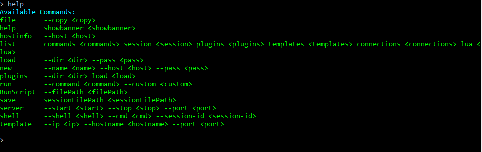 | Create new session | new --name "test" --host "192.168.1.1" --pass "pass" |