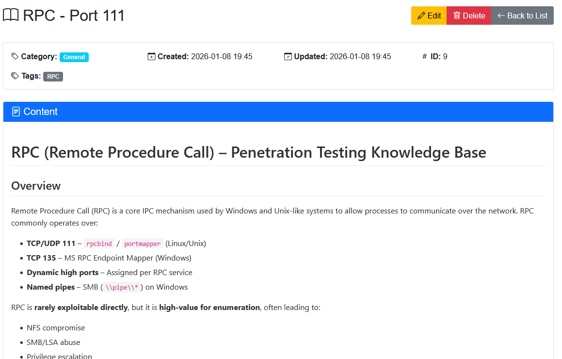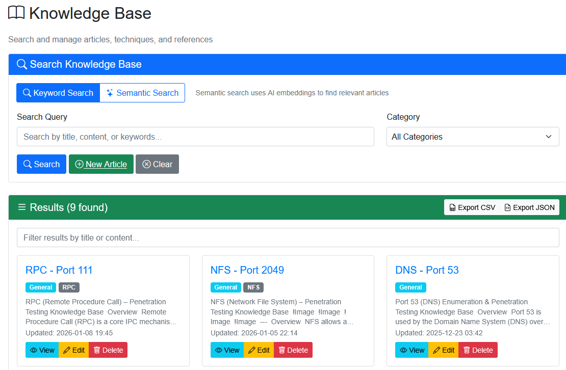 Use the Knowledge Base to build a living library of techniques, checklists, and reference material that supports ongoing engagements.